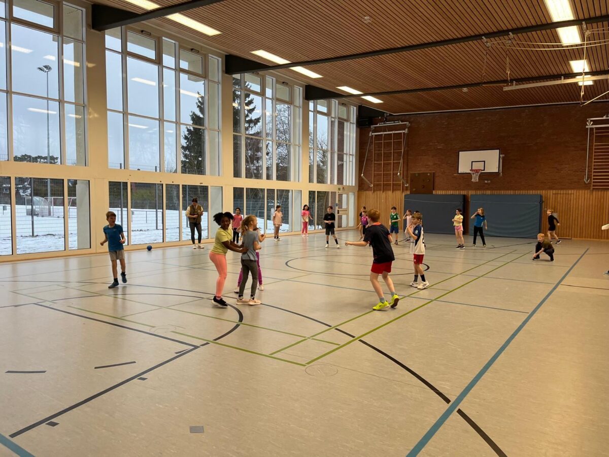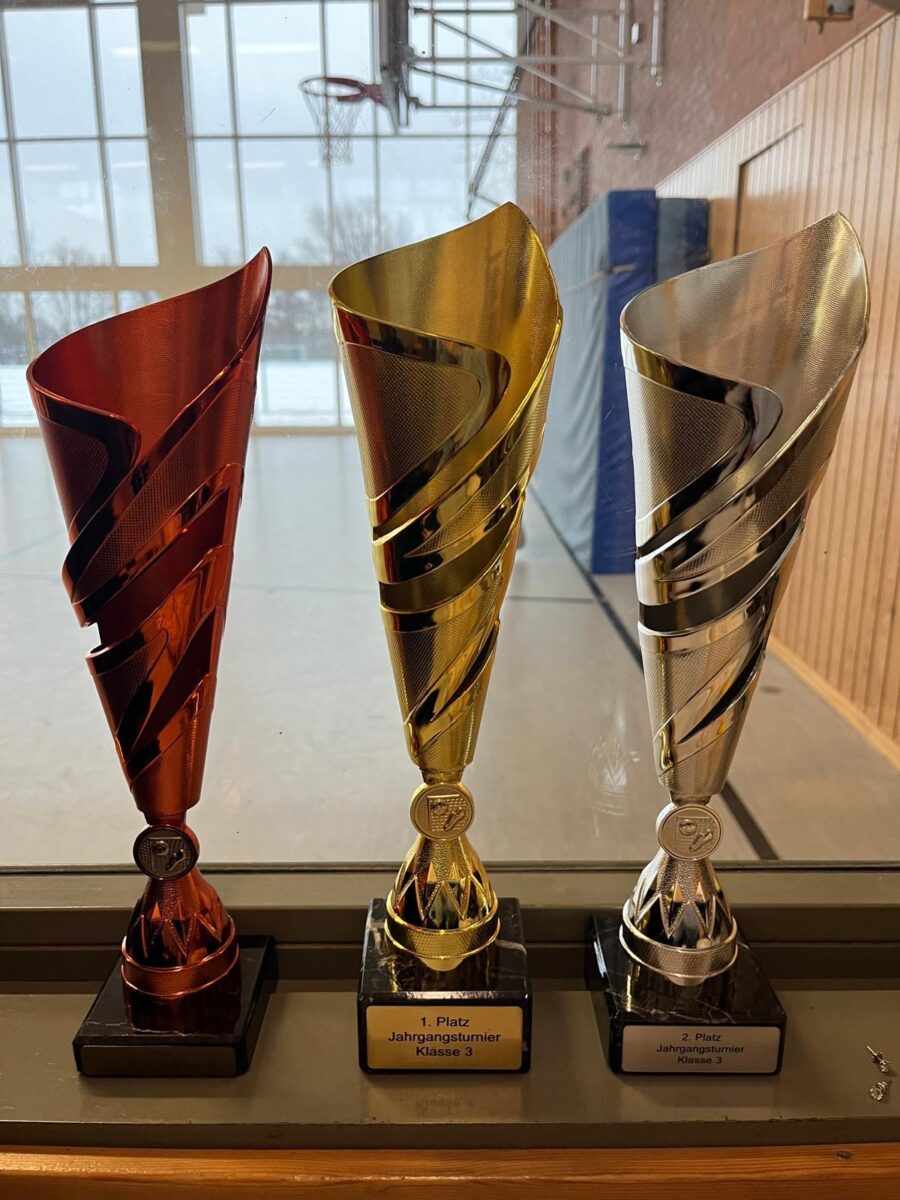 Beim schulinternen Jahrgangsturnier der 3. Klassen im Zwei-Felder-Ball erlebten alle Kinder einen spannenden und bewegungsreichen Vormittag. Mit viel Begeisterung, Einsatzfreude und Teamgeist traten die Mannschaften gegeneinander an und sorgten für mitreißende Spiele. Besonders erfreulich war das überwiegend faire Spiel aller Teams. Die Kinder hielten sich an die Spielregeln, unterstützten sich gegenseitig und zeigten großen Sportsgeist. Viele Begegnungen endeten unentschieden, sodass es immer wieder zu einem Wechsel kam, auf welchem Feld sich mehr Kinder befanden. Spannung war bis zum Schluss garantiert. Die Teams der Fledermäuse, Igel und Möwen gaben dabei alles und kämpften mit viel Motivation um jeden Punkt. Am Ende konnten sich die Fledermäuse durchsetzen und sich über den goldenen Pokal freuen. Den zweiten Platz belegten die Igel und sicherten sich Silber, während die Möwen mit Bronze ebenfalls stolz das Siegerpodest komplettierten. Die Übergabe der Pokale fand auf unserer letzten Showtime statt. Insgesamt war es ein gelungener Vormittag voller Bewegung, Fairness und gemeinsamer Freude am Sport, der sicher noch lange in Erinnerung bleiben wird.
