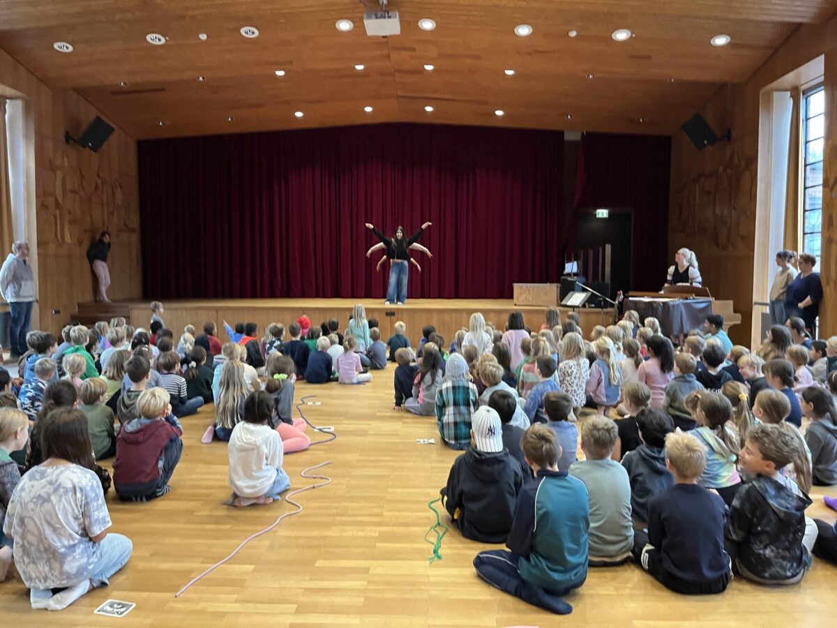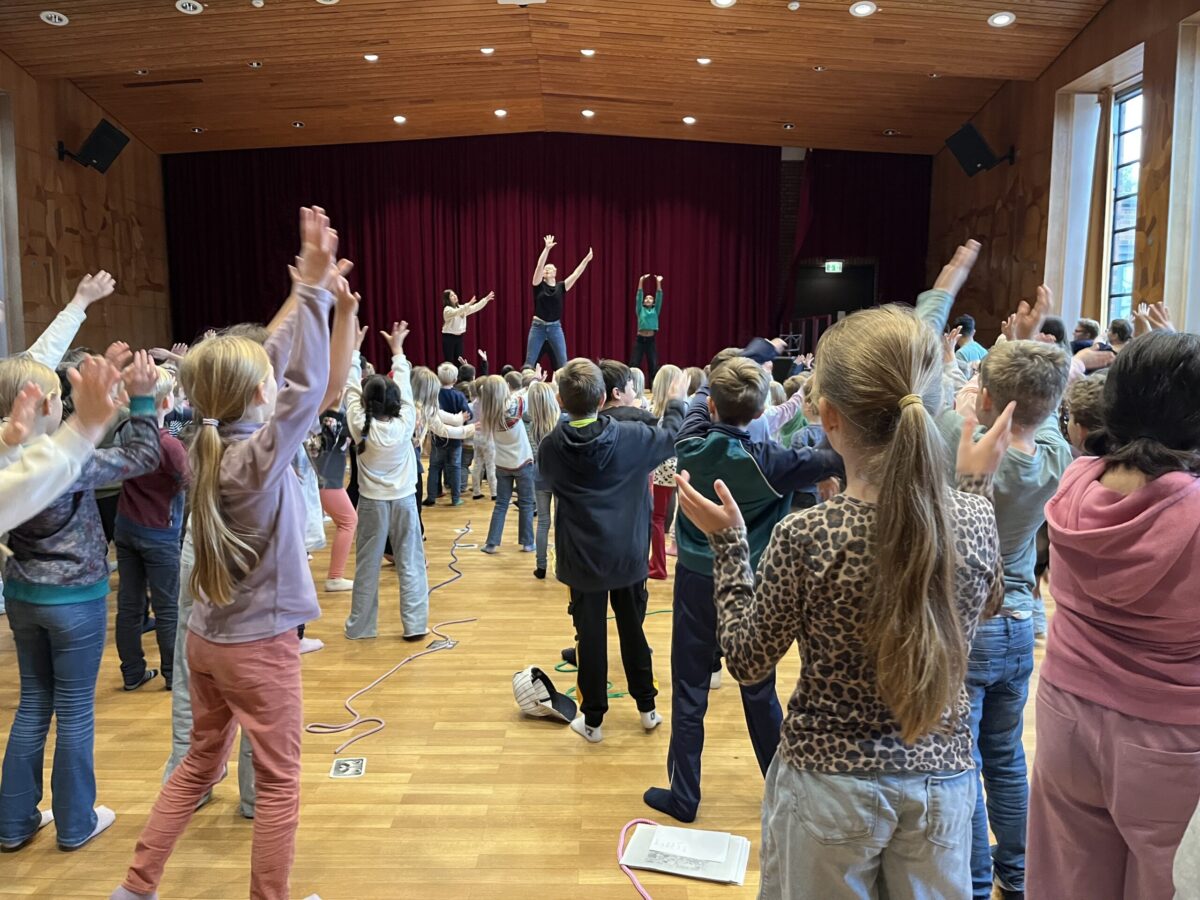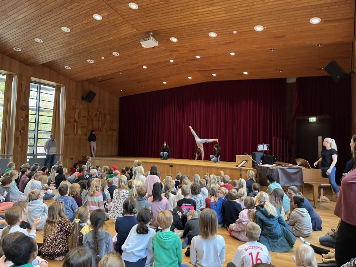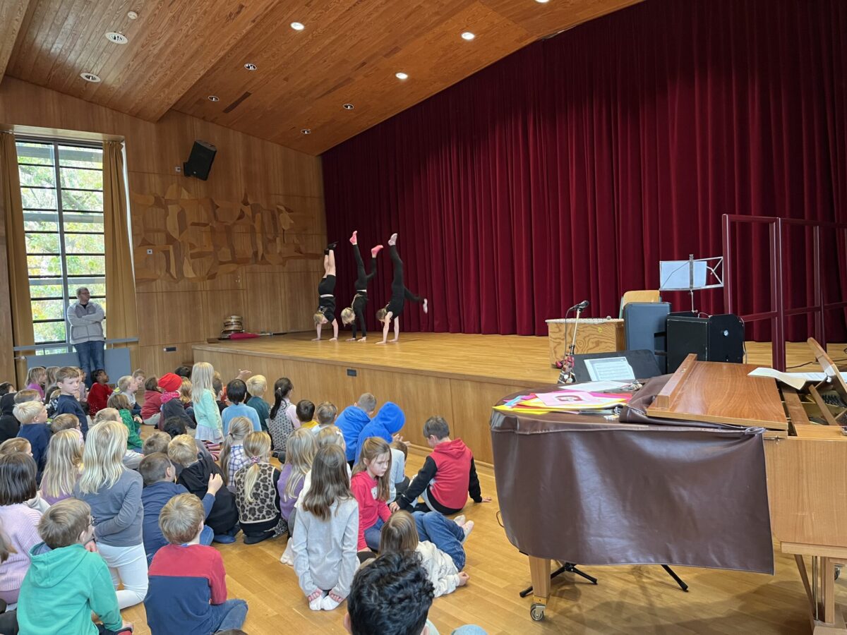 Wie immer am letzten Schultag vor den Ferien fand auch diesmal vor den Herbstferien in der zweiten Stunde die Showtime statt. Die ganze Schule versammelte sich in der Aula. Es gab wieder Beiträge aus verschiedenen Klassen. Ganze Klassen oder einzelne Gruppen präsentierten sich und auch ein gemeinsamer Tanz fehlte nicht.