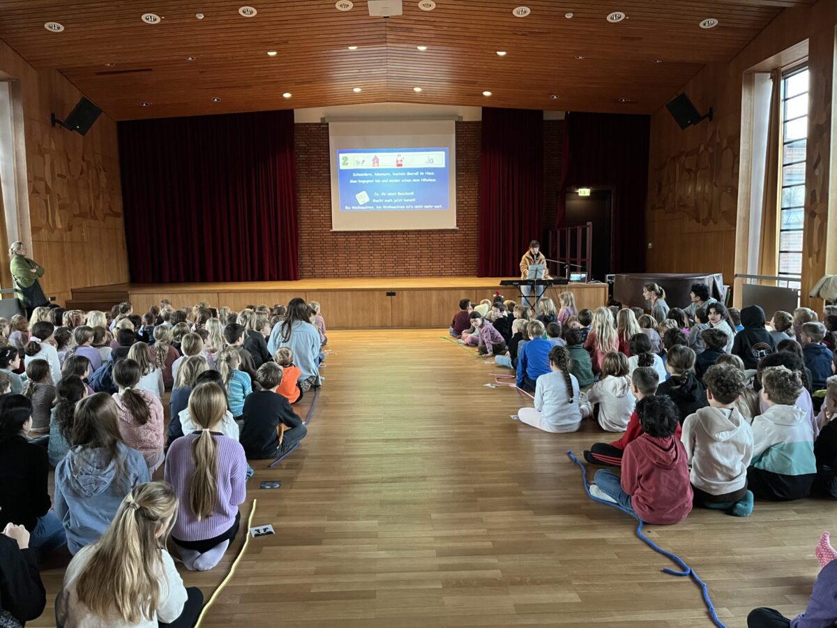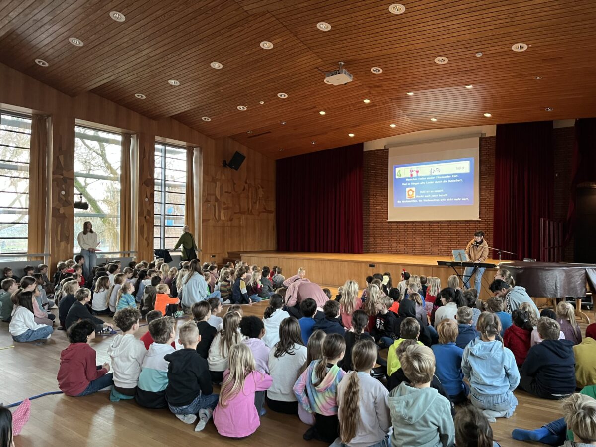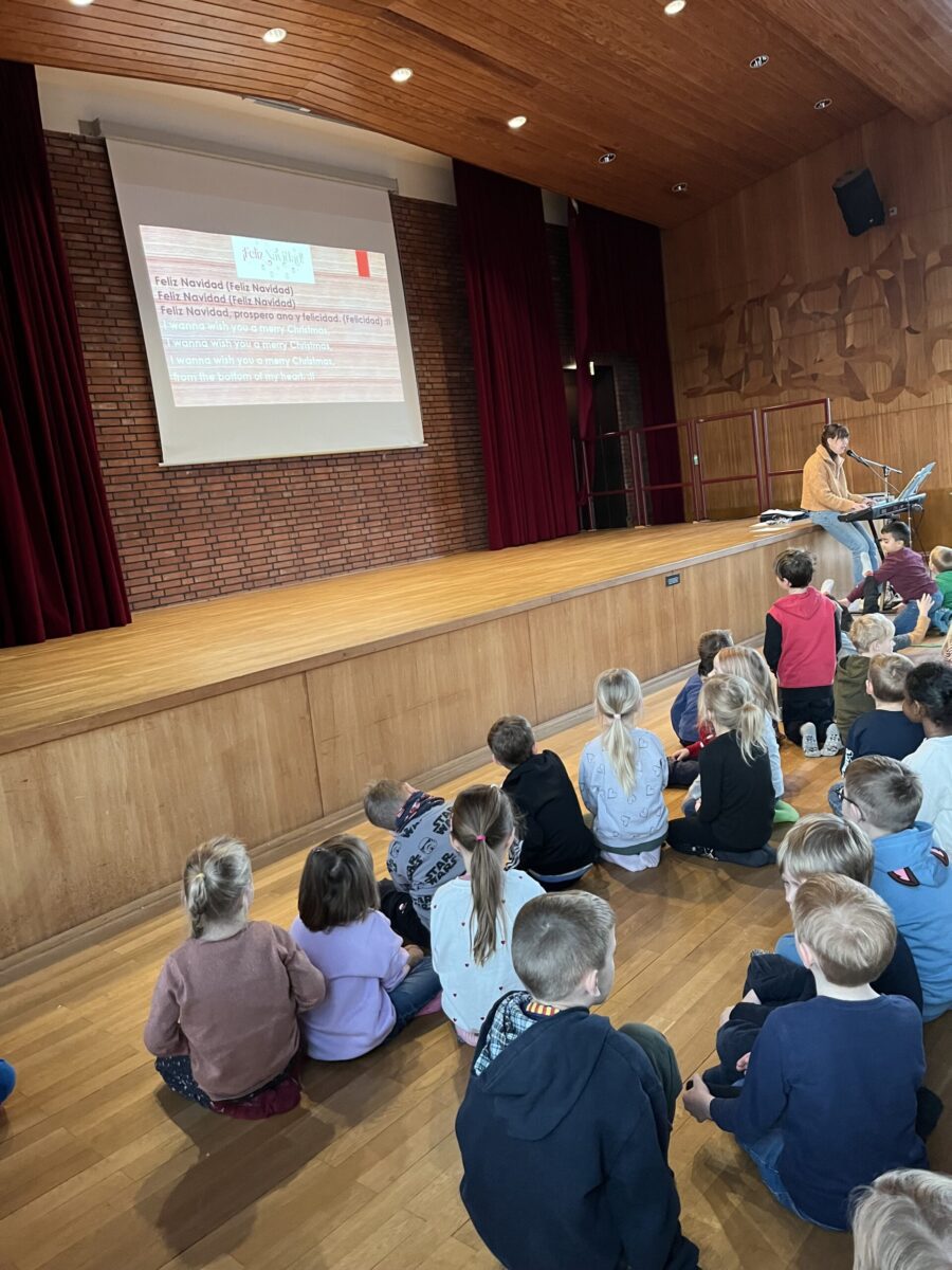 Auch das montägliche Weihnachtssingen in der Aula hat nun bereits einmal stattgefunden. Ob „Schneeflöckchen, Weißröckchen“, „Feliz Navidad“, „Stern über Bethlehem“ oder auch die anderen Lieder, sie wurden in den Klassen geübt und werden an den drei Montagen im Dezember von Kindern und LehrerInnen zusammen gesungen.